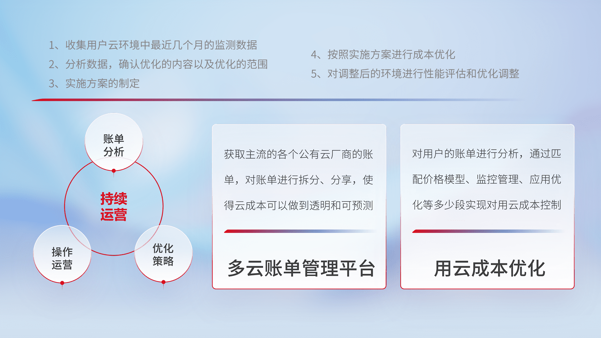 通过多云纳管,,以统一的资源数据模型把客户的云资源进行抽象和封装,,,进而实现对多云资源的统一操作,,,,保障云资源管理的可靠性、、、稳定性与可用性。。量身定制化运维内容,,,,配置、、开发运维、、、补丁管理、、、、备份、、、监控、、认证和访问管理、、审计和日常巡检等,,,保障在用云过程中的可靠度,,稳定度以及高可用率。。。